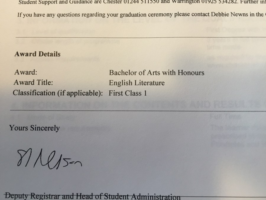 I am graduating with a first class honours, because of you. Whether it was your intention or not, your words have gotten me through the last three years and helped me achieve what I always hoped I could do but often thought was impossible. So I want to thank you for meeting me that day and for judging me as so many others do, because in doing so you gave me a reason to make myself and everyone around me proud. You forced me to find the self belief and self-worth I had lost, you shocked me out of my depression and inspired me to be the person I knew I was, but that you were too blind to see.